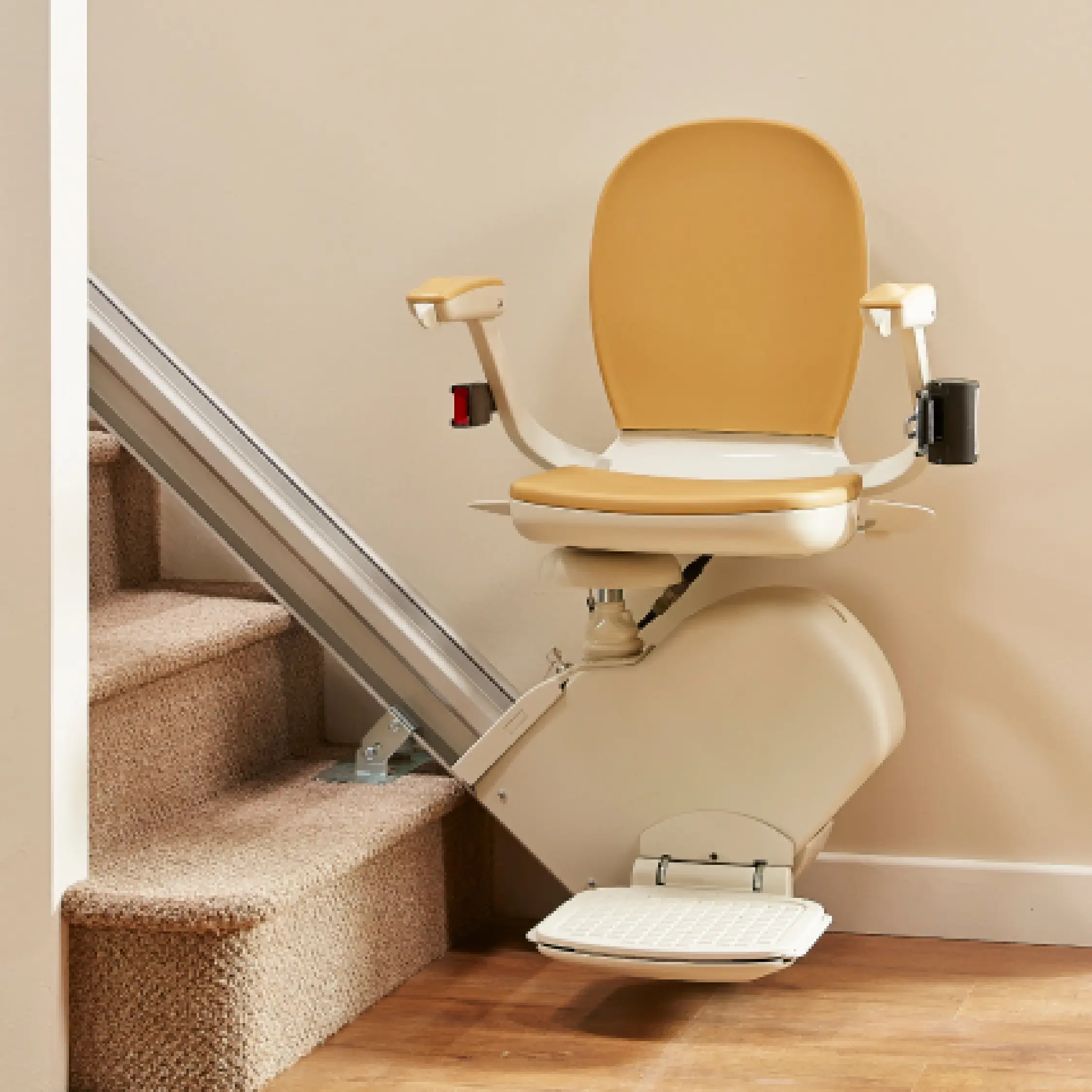 Ergonomically designed stair lift for straight stairs, offering enhanced comfort, safety, and easy operation.